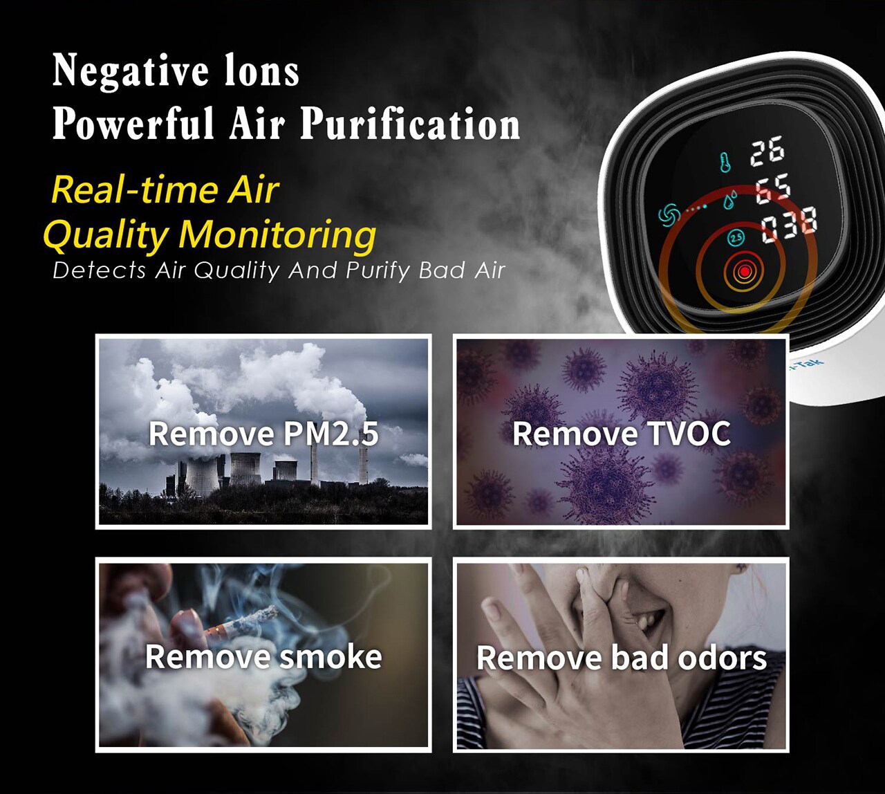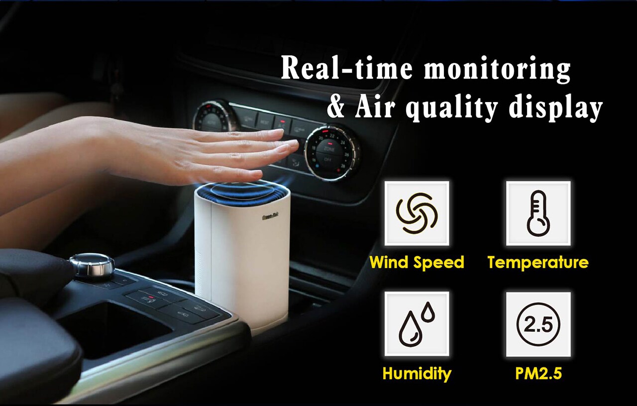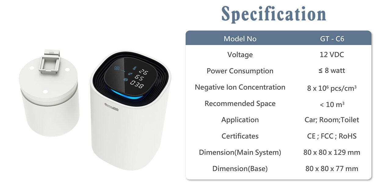 Le purificateur d'air de voiture à ions négatifs portable GT-C6 Green-Tak génère un nombre considérable d'ions négatifs pour absorber la fumée, la poussière, les bactéries et autres particules nocives, nettoyant facilement et rapidement l'air.